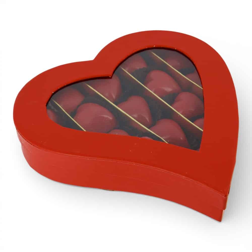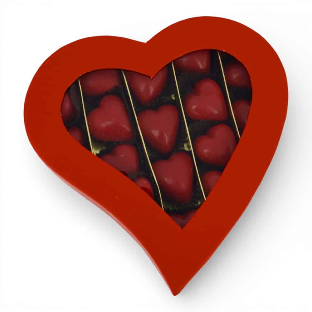 La Love Box 16 chocolats est une boîte en forme de cœur rouge contenant 16 chocolats au praliné lait. Tous les chocolats sont en forme de cœur. Le poids net est d’environ 220 g.