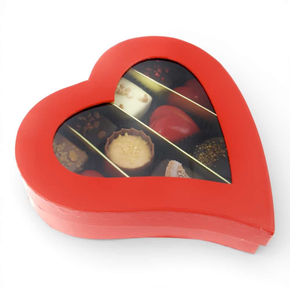 La Love Box 10 chocolats est un cœur rouge contenant 10 chocolats au lait, noir et blanc. L’assortiment comprend différentes recettes : pralinés, ganaches et autres bouchées, selon les disponibilités. Le poids net est d’environ 140 g.