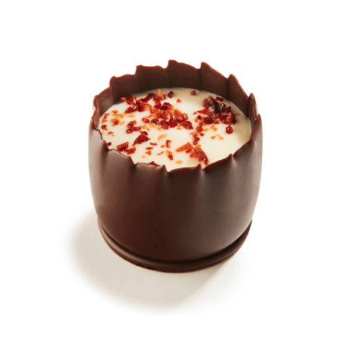 Caramel et GiandujaDu caramel et du Gianduja à l’intérieur d’une tasse de chocolat noir (sans liqueur mais avec +2% d’alcool).