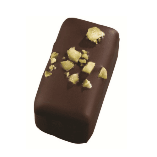 Pâte d’amandes au goût pistacheUn chocolat noir pris entre deux tranches de pâte d’amande au gout raffiné de pistache.