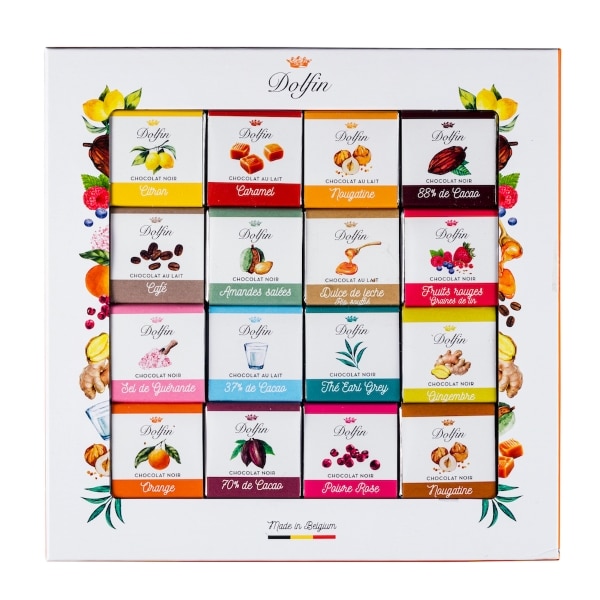 Pâte de cacao, sucre, beurre de cacao, poudre de lait, cacao maigre, nougatine 4% (sucre, noisettes), amandes salées 4% (amandes, soja, blé, sel), caramel 4% (sucre, sirop de glucose, lait entier en poudre, crème fraiche (lait), beurre salé (lait) , sel de Guérande, émulsifiant : lécithine de colza), poudre de citron 4%, fruits rouges 3% (fraises, framboises, cassis, groseilles), graines de lin 2%, thé Earl grey 2%, café 2%, gingembre 1 %, poivre rose 1%, concentré d’orange 1% (purée d’orange, fibres de pomme, fibres d’agrume, huile essentielle d’orange, curcuma), sel de Guérande 0,2%, émulsifiant : lécithine de soja, arômes naturels, essence de bergamote. Cacao : lait 37%, noir 60%, extra noir 70% minimum.
