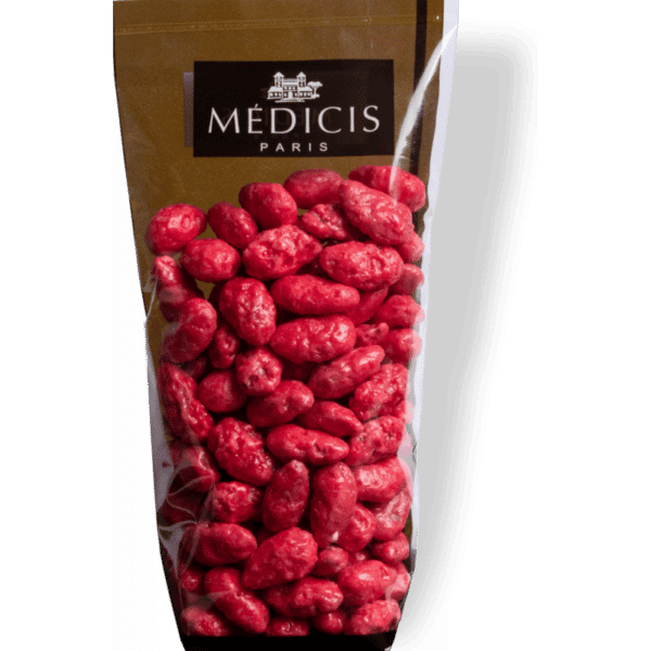 Les pralines roses Médicis sont composées de délicieuses amandes grillées enrobées de sucre caramélisé et vernis en rose.